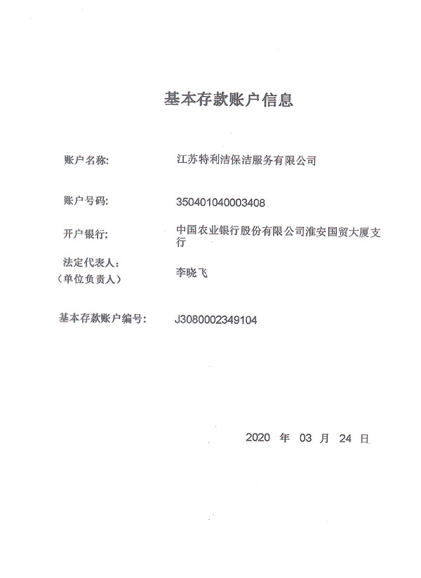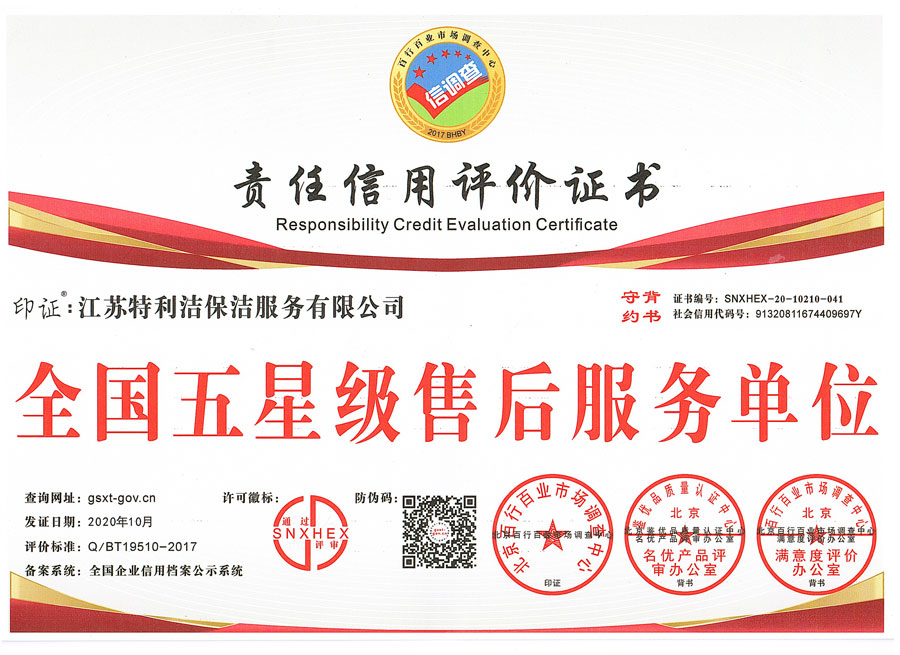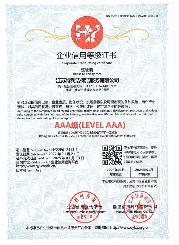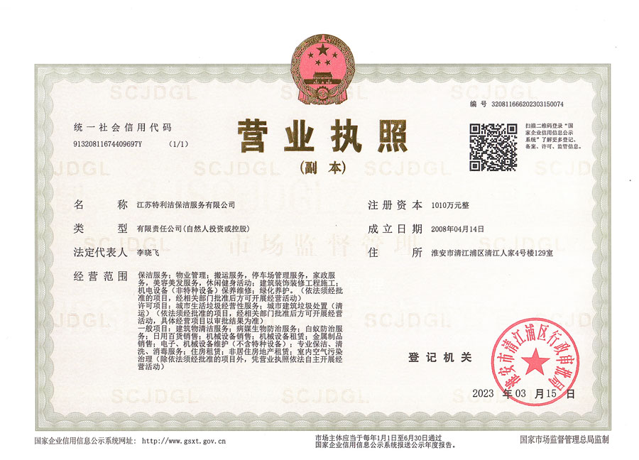 江蘇特利潔保潔服務有限公司(前稱為淮安市特利潔保潔服務有限公司),成立于2003年,于2018年經工商變更登記為“江蘇特利潔保潔服務有限公司”,是經工商部門登記注冊的合法企業。公司員工經系統培訓后上崗,本公司全部采用特利潔專業清洗設備、藥劑,并秉承了特利潔先進的管理模式,具備了專業的清洗技術、服務和網絡優勢以及一批訓練有素的專業清潔隊伍及管理人員,致力于推動淮安清洗行業朝著規范化、專業化、標準化方向發展。公司成立至今,經過我們全體員工的不懈努力,以及本著“誠信、專業、周到”的服務使得接受過我們服務的每一位客戶均能成為我們的長期合作對象。公司也從起初十幾名員工的小公司逐漸發展壯大,現已初具規模,并在保潔行業當中占據一定份額。現與恒大集團等世界500強企業建立戰略合作。2018年10月公司取得三A信用評級、三A重合同守信用單位...